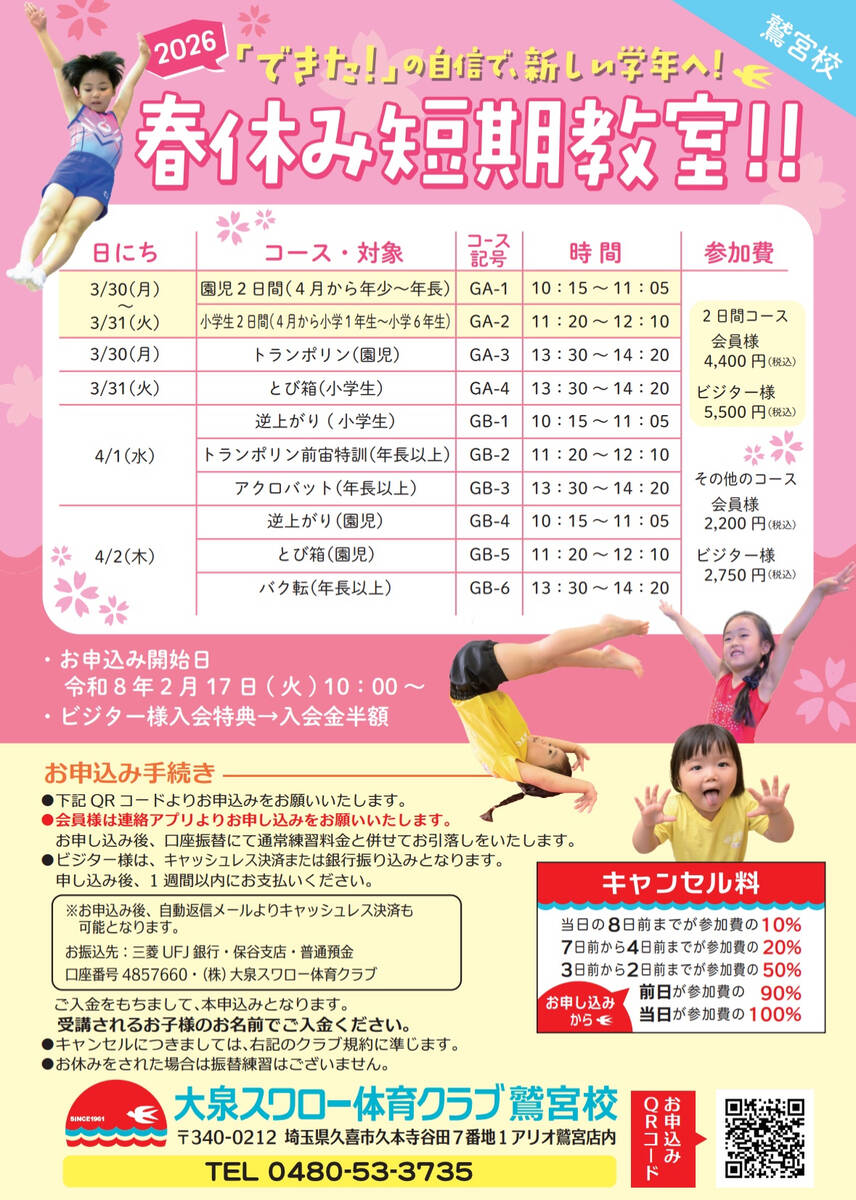 春休みはスワローで、体操・トランポリンを思いっきり楽しもう‼️